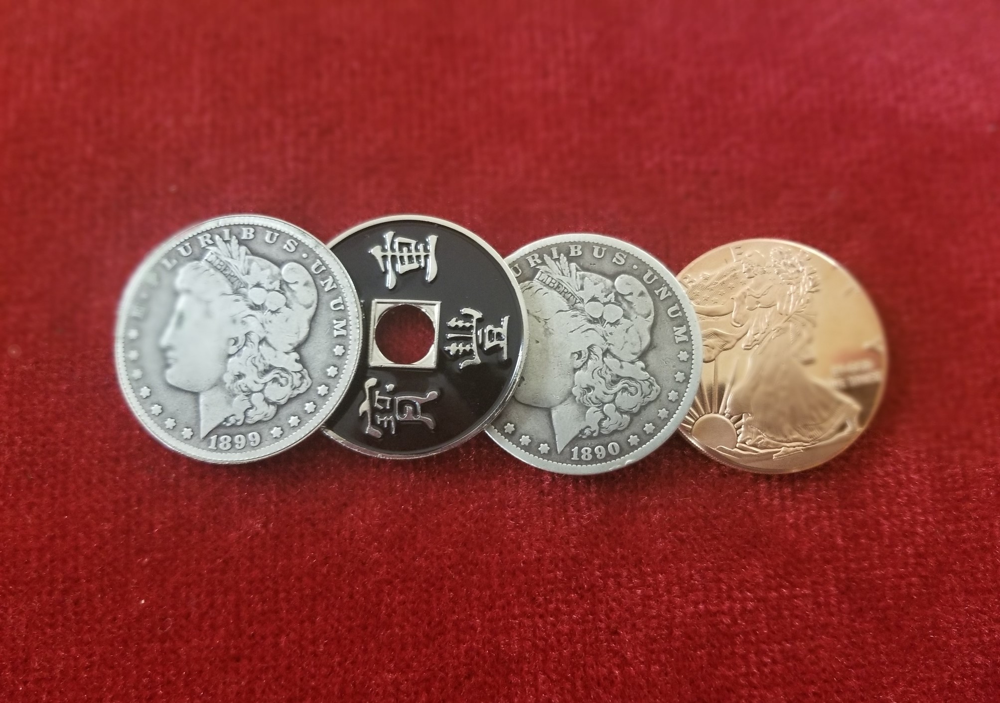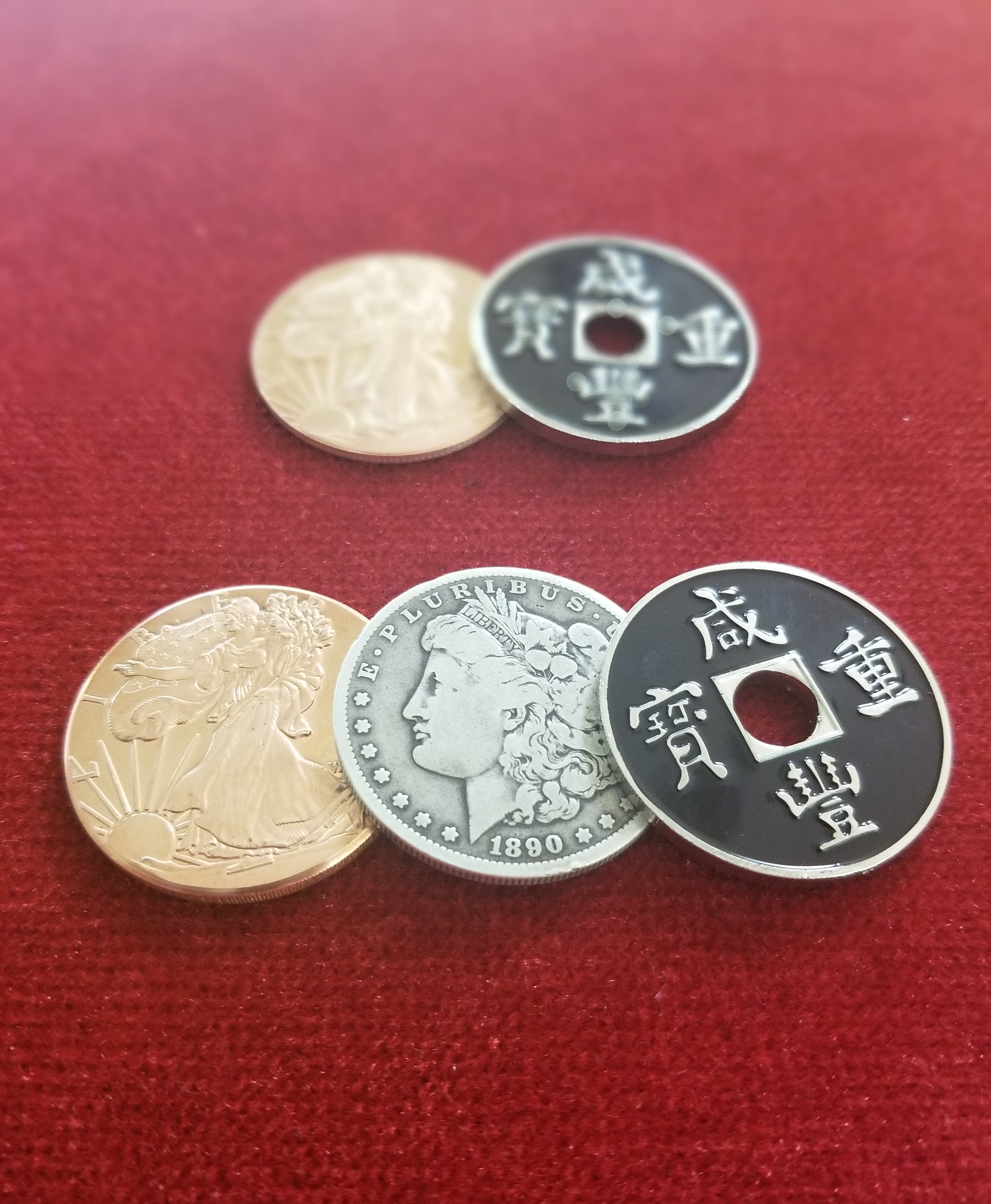 We now have the classic coin transposition in Morgan Dollar sets. We have had our very own Dollar size Chinese coins manufactured. These are top quality sets. Each set is handcrafted. This has to be one of the finest coin tricks ever created. Once again our in house coin expert has made several small changes to this set, making it a set to treasure.
